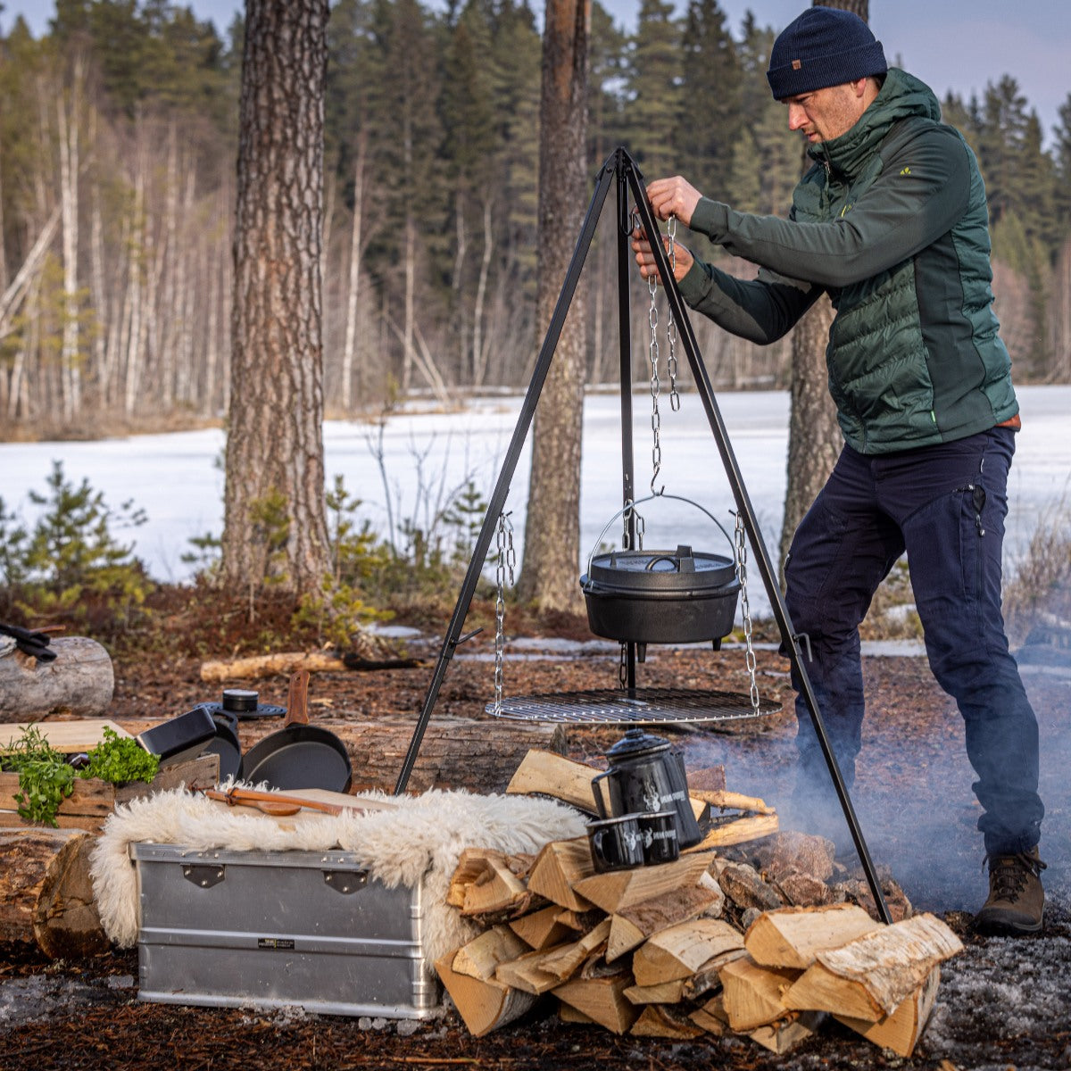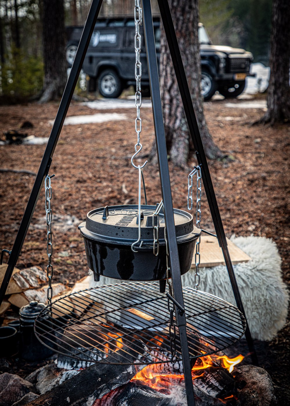 Vår VH.TRIPODXL är utrustad med en praktisk remskiva upptill, vilket gör att du enkelt kan justera höjden på din Dutch Oven utan att behöva bära hela lasten. Dessutom är benen utrustade med extra krokar för att fästa kedjor, så att du kan hänga en Dutch Oven och ett grillgaller samtidigt, vilket garanterar en mångsidig matlagningsupplevelse.