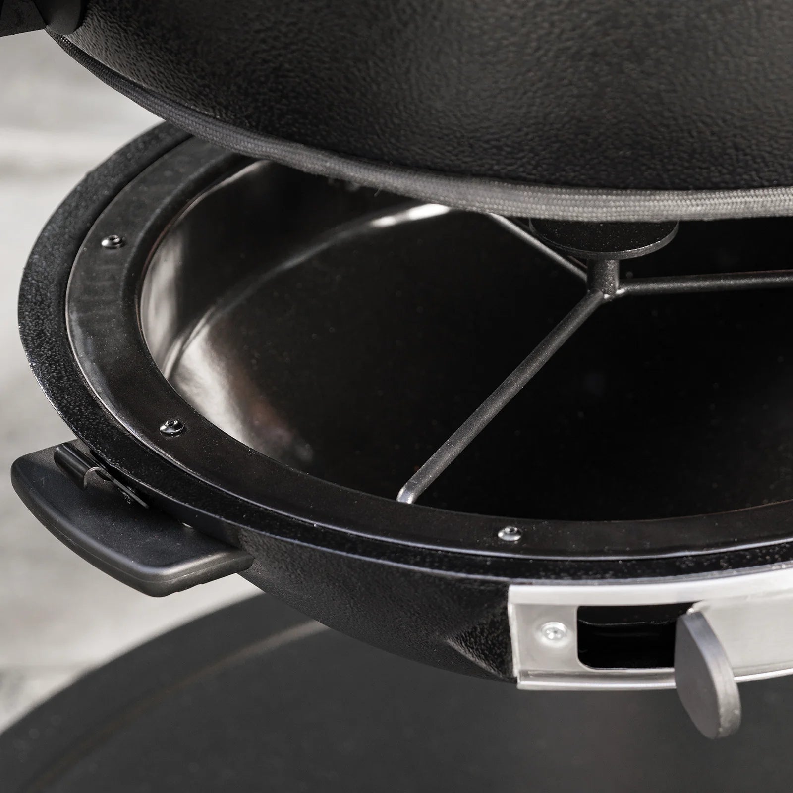 - Kolgrill i Kamado-stil med vagn och låsbara hjul för enkel förflyttning av grillen
