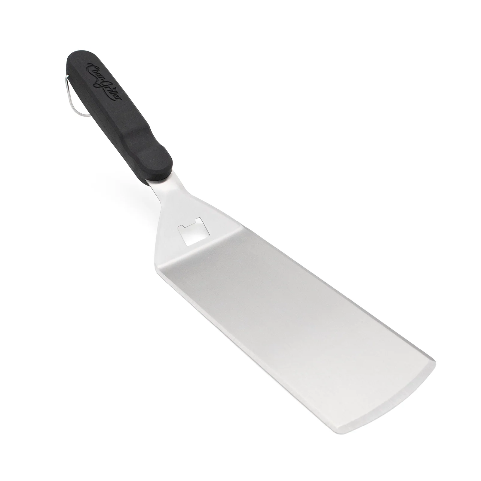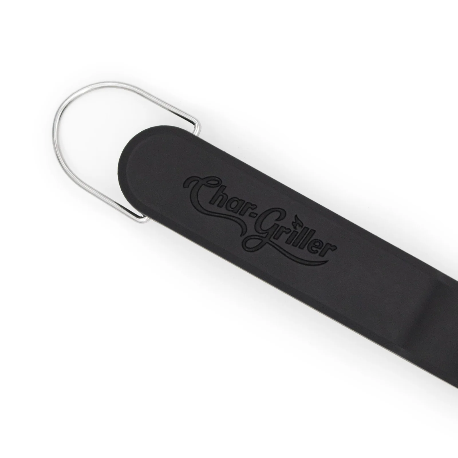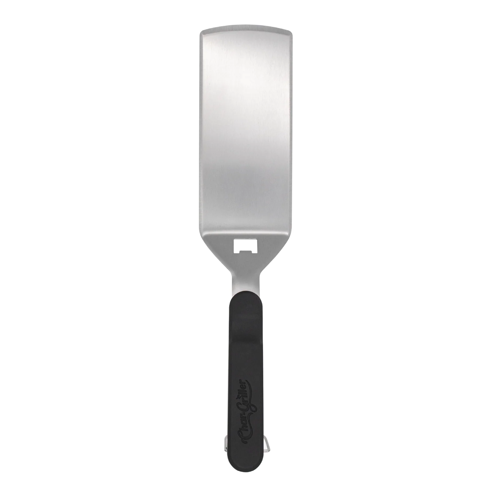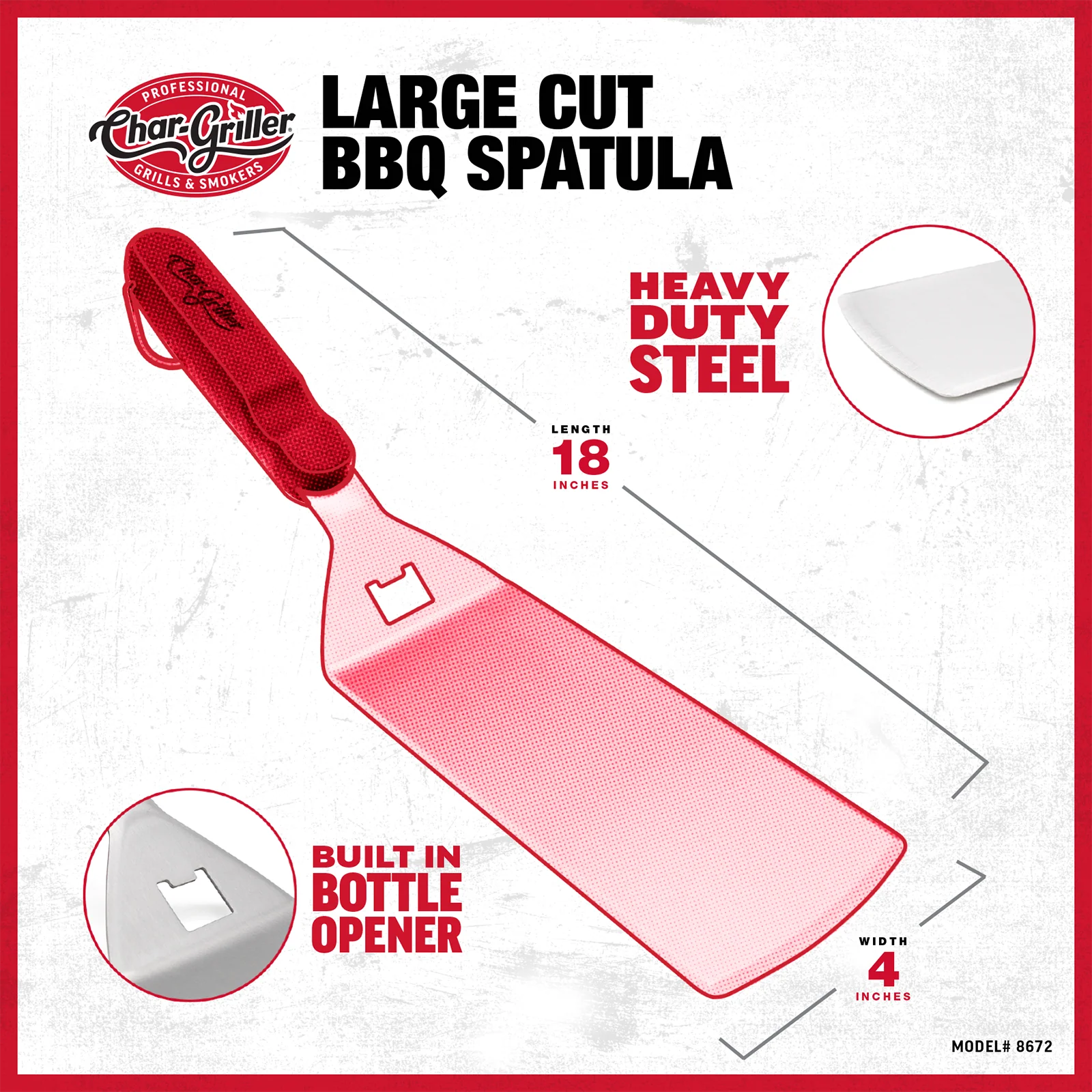 Char-Griller Large Cut BBQ Spatula är byggd för att hantera alla typer av kött och alla måltider. Använd den för att vända, skopa eller krossa! Den har en kraftig konstruktion, ett handtag med mjukt grepp, en inbyggd flasköppnare och en krok för enkel förvaring.