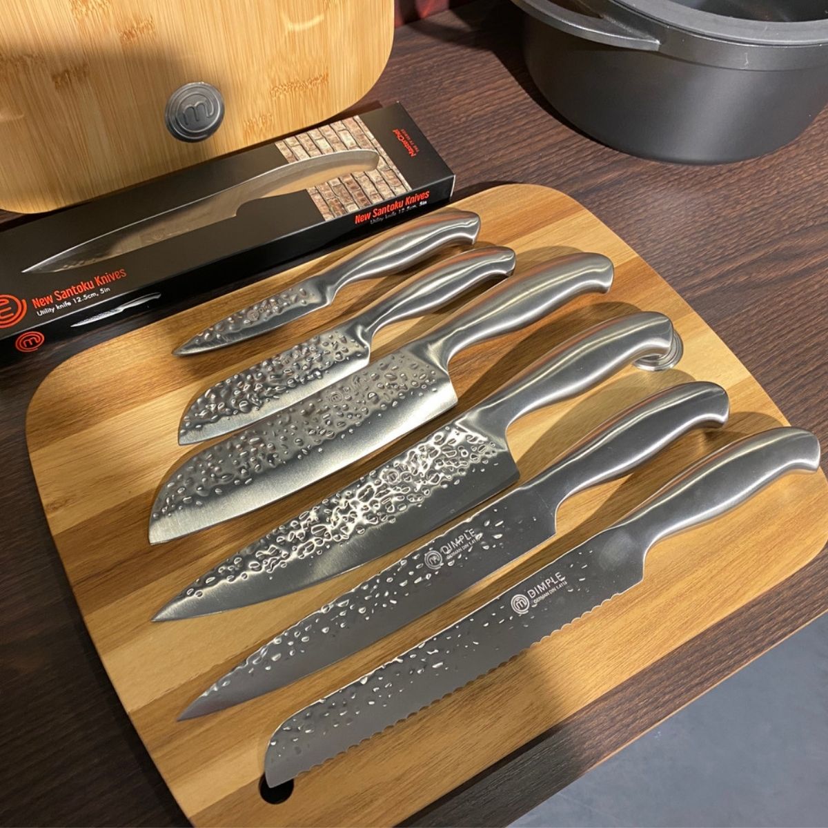 MasterChefs nya "New Santoku" kockknivar är gjorda av högkvalitativt tyskt 18/10 rostfritt stål. Det ergonomiska handtaget har bra balans och ger komfort, vilket möjliggör smidigare användning. "Hammarfinishen" hjälper till att förhindra att mat fastnar, vilket säkerställer enkel skärning. Idealisk för alla typer av kött, fisk, frukt, grönsaker etc.