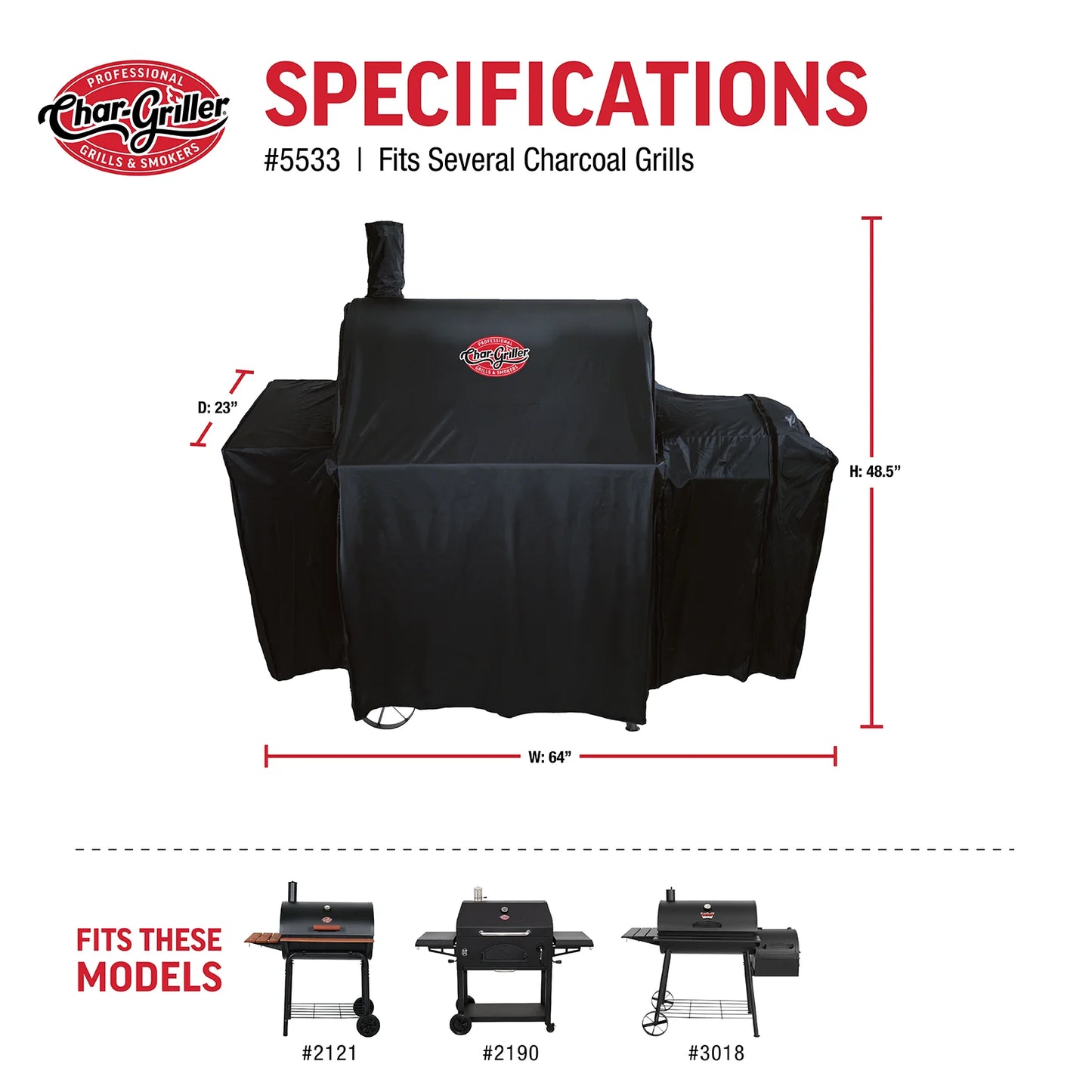 Det här designade Char-Griller Universal Grill Cover är tillverkat av ett slitstarkt, kraftigt tyg. Detta överdrag ger ett långvarigt skydd mot hällregn, isande snö och brännande sol. Det lätta men ändå slitstarka överdraget är lätt att sätta på och håller din grill i toppform säsong efter säsong. Skydda din investering och förläng livslängden på din Char-Griller.