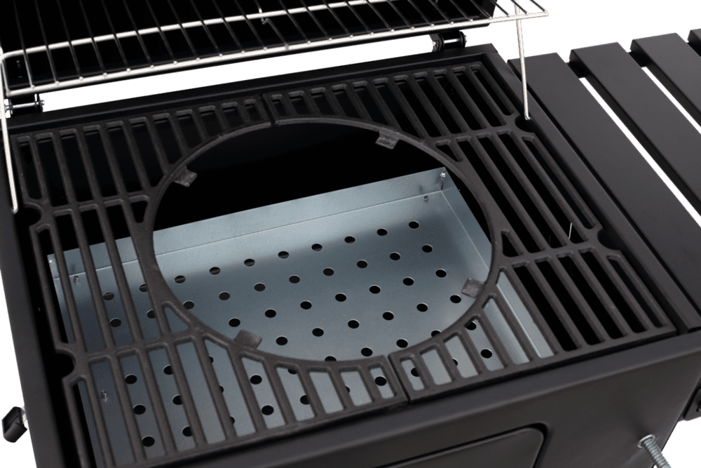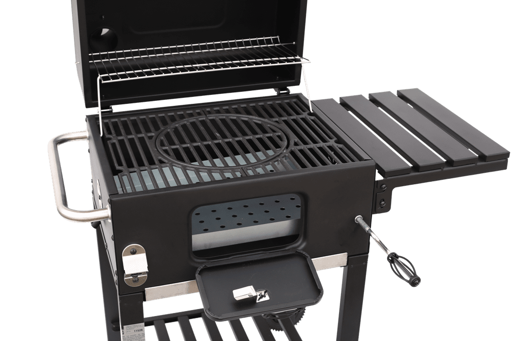 Vill du ha exakt kontroll över värmen? Det höj- och sänkbara koltråget med vev gör det enkelt att anpassa temperaturen efter råvarorna. Den perforerade glödbädden ser till att kolen brinner jämnt, medan den smarta påfyllningsluckan låter dig fylla på bränsle utan att avbryta grillningen.