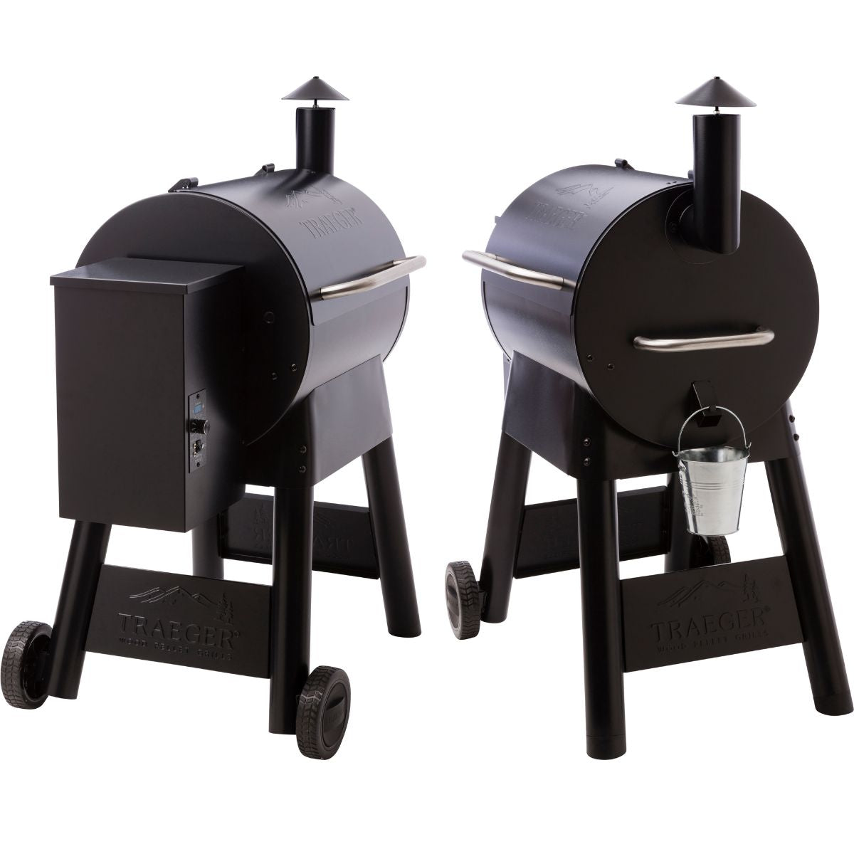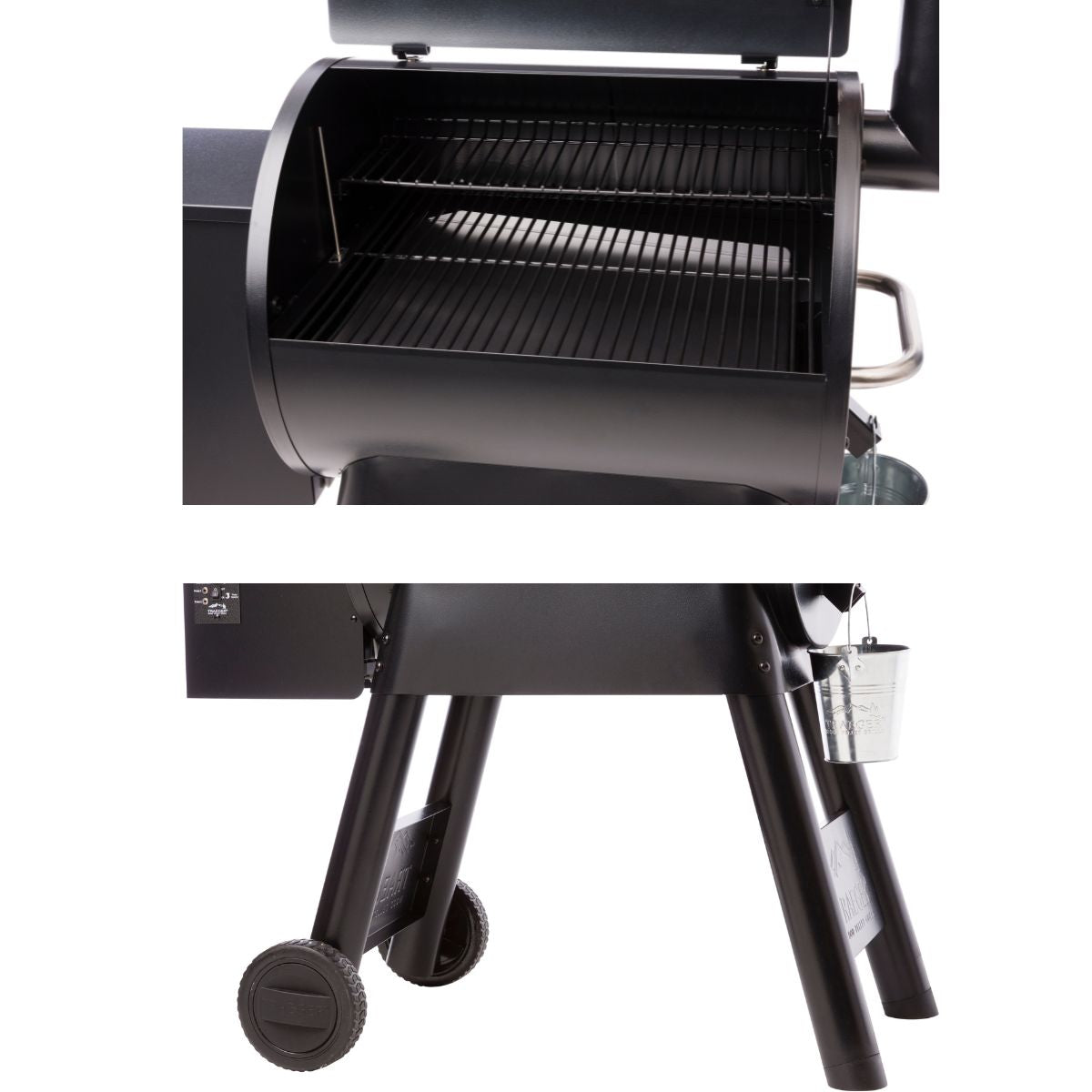 Traegers 22 tums kultgrill i all sin godhet. En riktig retromaskin. År av försäljning har visat att detta är en extremt hållbar modell. Superenkel kontrollpanel, starkt hölje och enkelt underhåll gör den till en riktig hushållsapparat i många år. Den tunnformade kokkammaren är gjord av pulverlackerat kvalitetsstål, som på grund av sin form säkerställer en idealisk fördelning av värme och rök i hela grillen. Tack vare detta kokar de emaljerade stålgallren på två nivåer lika på båda nivåerna. Från kontrollpanelen kan du ställa in temperaturen och välja släckningsläge för att stoppa grillningen. Grillen levereras med två sonder för att övervaka köttets innertemperatur. Om du trycker på knappen "Sond" en gång visas temperaturen på den första sonden, trycker du två gånger på den andra sondens temperatur. Finjusterad grilltemperaturbalans och digitalt kontrollsystem säkerställer ett utsökt slutresultat. Brända pellets kan snabbt avlägsnas genom pelletsutloppsluckan.