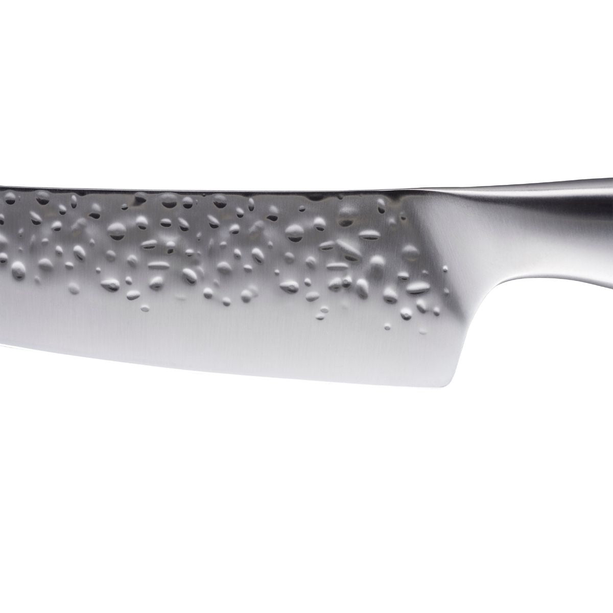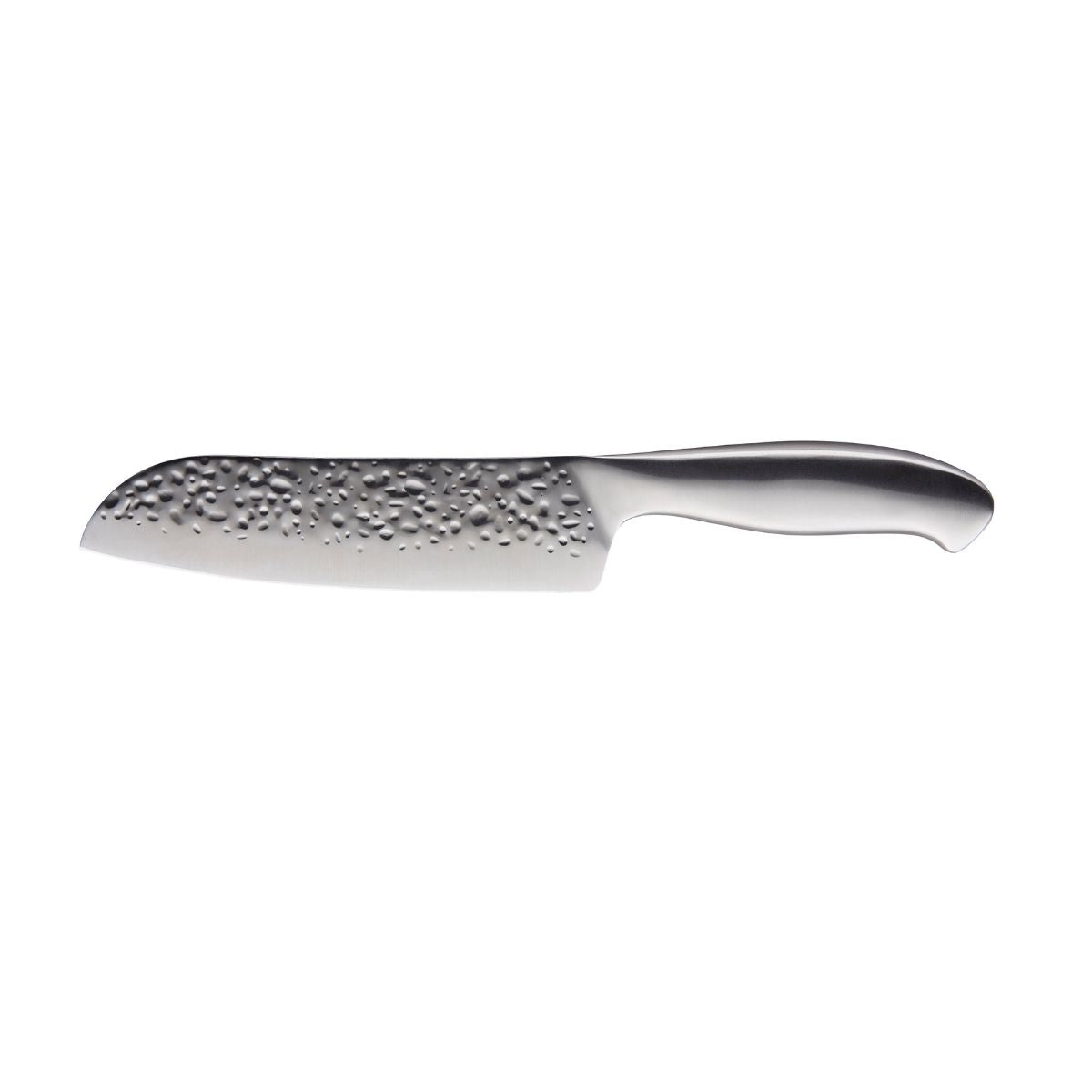 MasterChefs nya "New Santoku" kockknivar är gjorda av högkvalitativt tyskt 18/10 rostfritt stål. Det ergonomiska handtaget har bra balans och ger komfort, vilket möjliggör smidigare användning. "Hammarfinishen" hjälper till att förhindra att mat fastnar, vilket säkerställer enkel skärning. Idealisk för alla typer av kött, fisk, frukt, grönsaker etc.