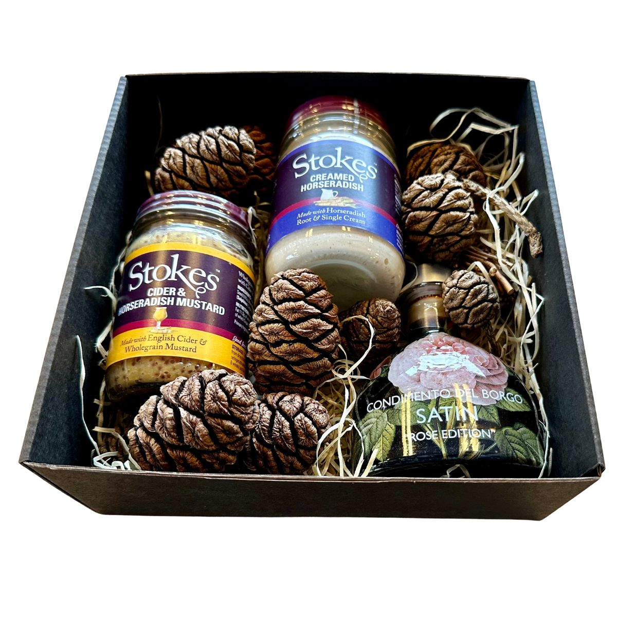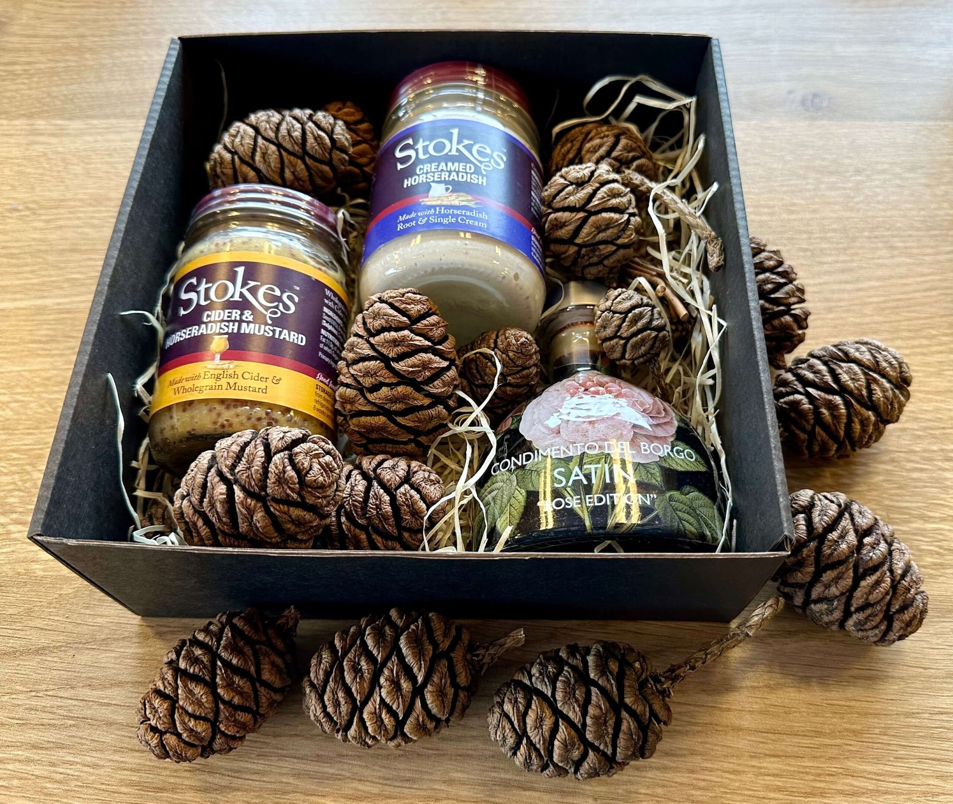 En vacker svart presentask med fönster, dekorerad med några torkade dyrbara och sällsynta kottar från världens högsta SEQUOIA-träd. Presentförpackningen innehåller:
