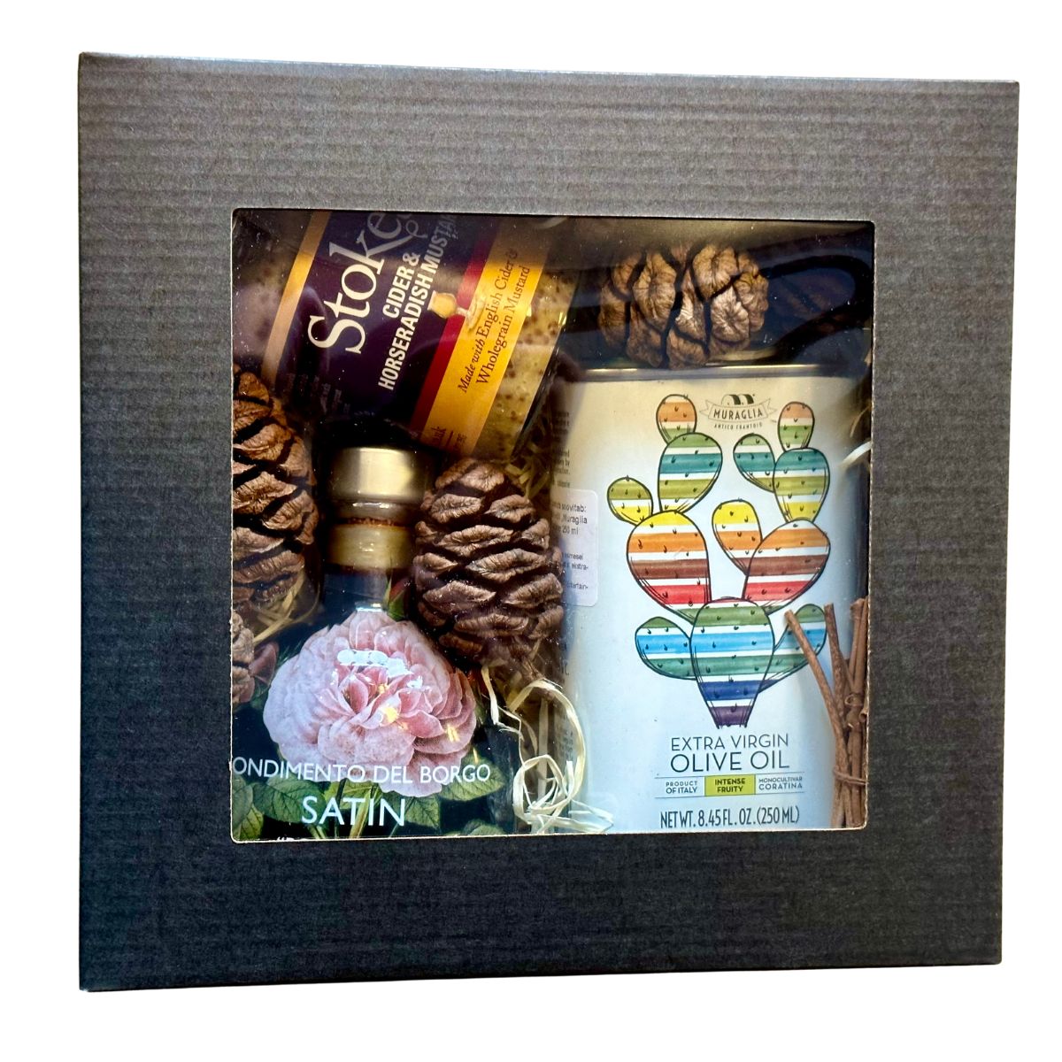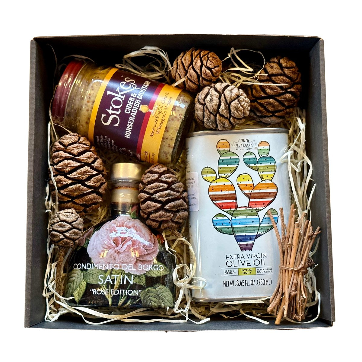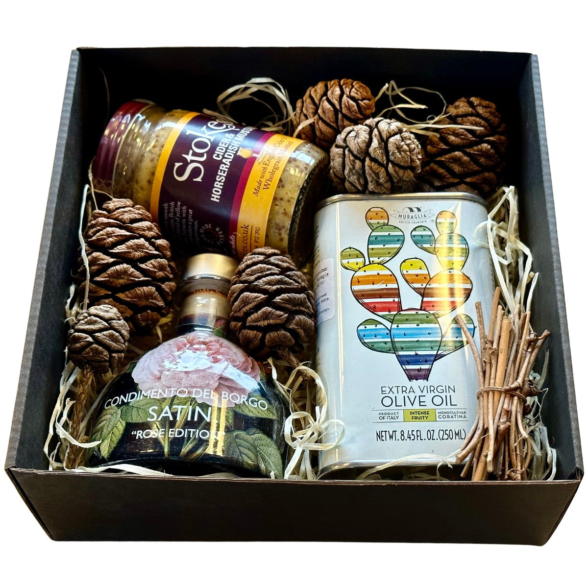 En vacker svart presentask med fönster, dekorerad med några torkade dyrbara och sällsynta kottar från världens högsta SEQUOIA-träd. Presentförpackningen innehåller: