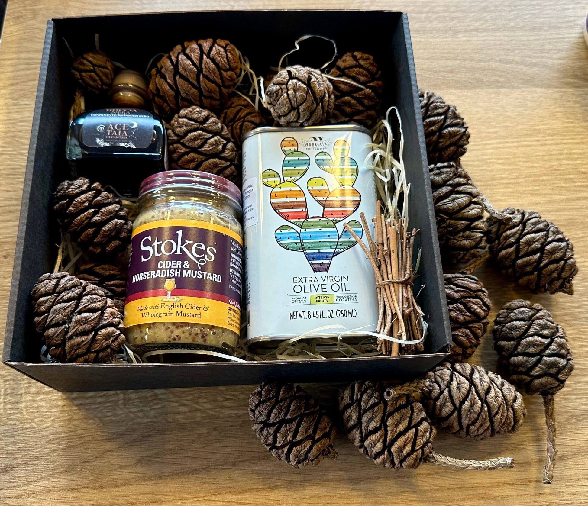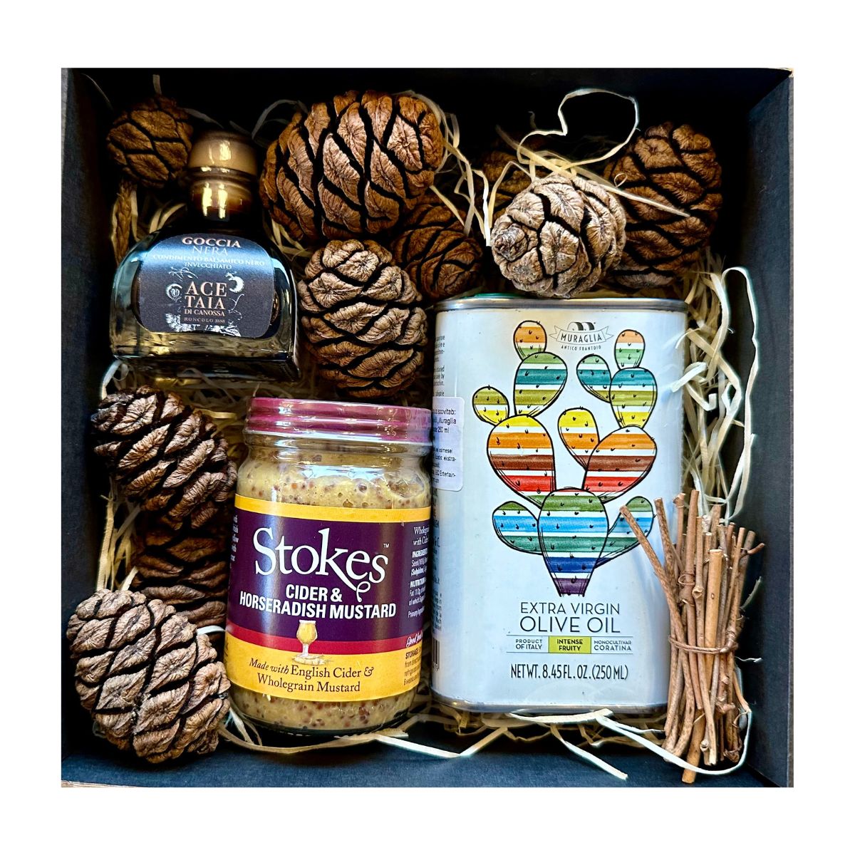 En vacker svart presentask med fönster, dekorerad med några torkade dyrbara och sällsynta kottar från världens högsta SEQUOIA-träd. Presentförpackningen innehåller: