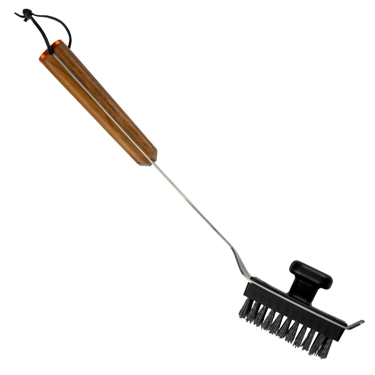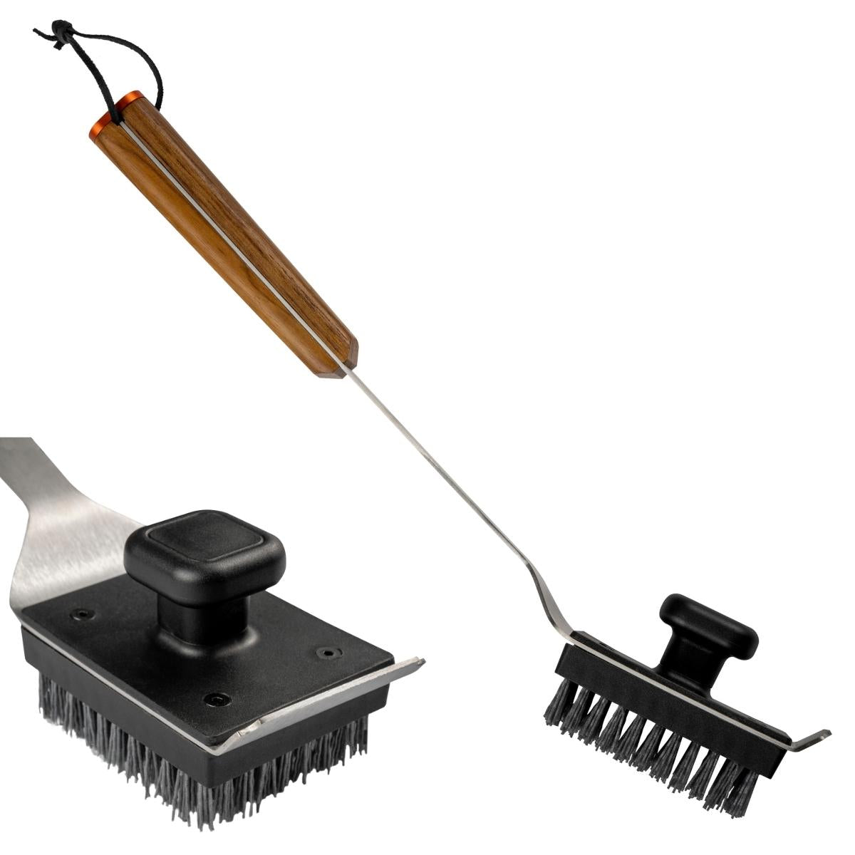 Rostfri konstruktion för hållbarhet, starkt handtag i teak, bekväm läderögla för upphängning, dubbelt handtag. Ersättningsborstar finns också.
