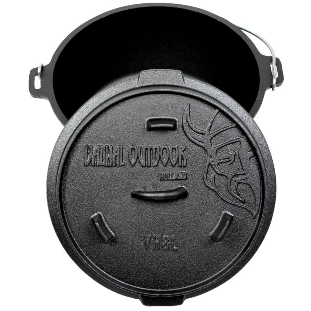 Designen på denna Dutch Oven är väl genomtänkt, och stor vikt har lagts vid dess mångsidiga användning och användarvänlighet. VH8L är en Dutch Oven utan fötter i botten. Eftersom botten är platt kan du enkelt använda den i din (kamado) grill, men även inomhus på din spis eller i din ugn. Vill du använda din Dutch Oven på ett sätt som behöver fötter i botten? Du kan enkelt lösa detta genom att använda VH23G från Valhal Outdoor. Om du placerar din Dutch Oven ovanpå detta har du skapat ben till din Dutch Oven med en platt botten. Locket kan användas upp och ner som en stekpanna och eftersom locket har ben kan du placera den direkt på värmekällan utan att "kväva" värmen.
