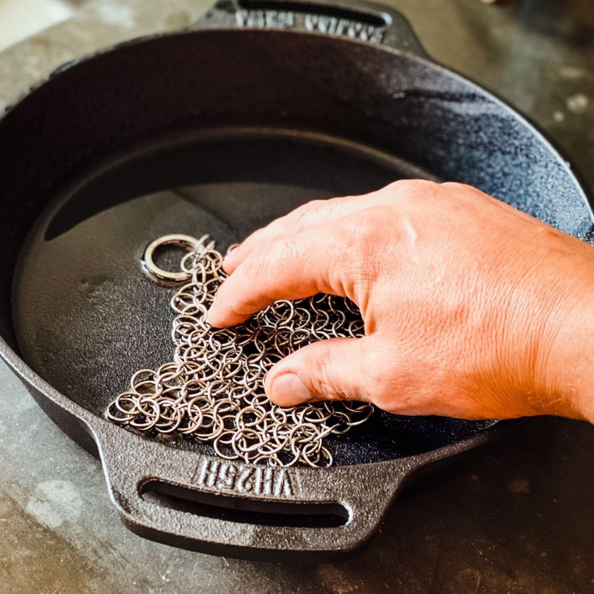 Kedjebrynjerengöraren från Valhal Outdoor är ett praktiskt verktyg för att rengöra dina gjutjärnspannor. Tack vare de flätade ringarna i rostfritt stål kan du enkelt ta bort fastklumpade matrester utan att skada pannans patina eller använda diskmedel. Kedjebrynjerengöraren kan återanvändas otaliga gånger och är mycket enkel att rengöra.